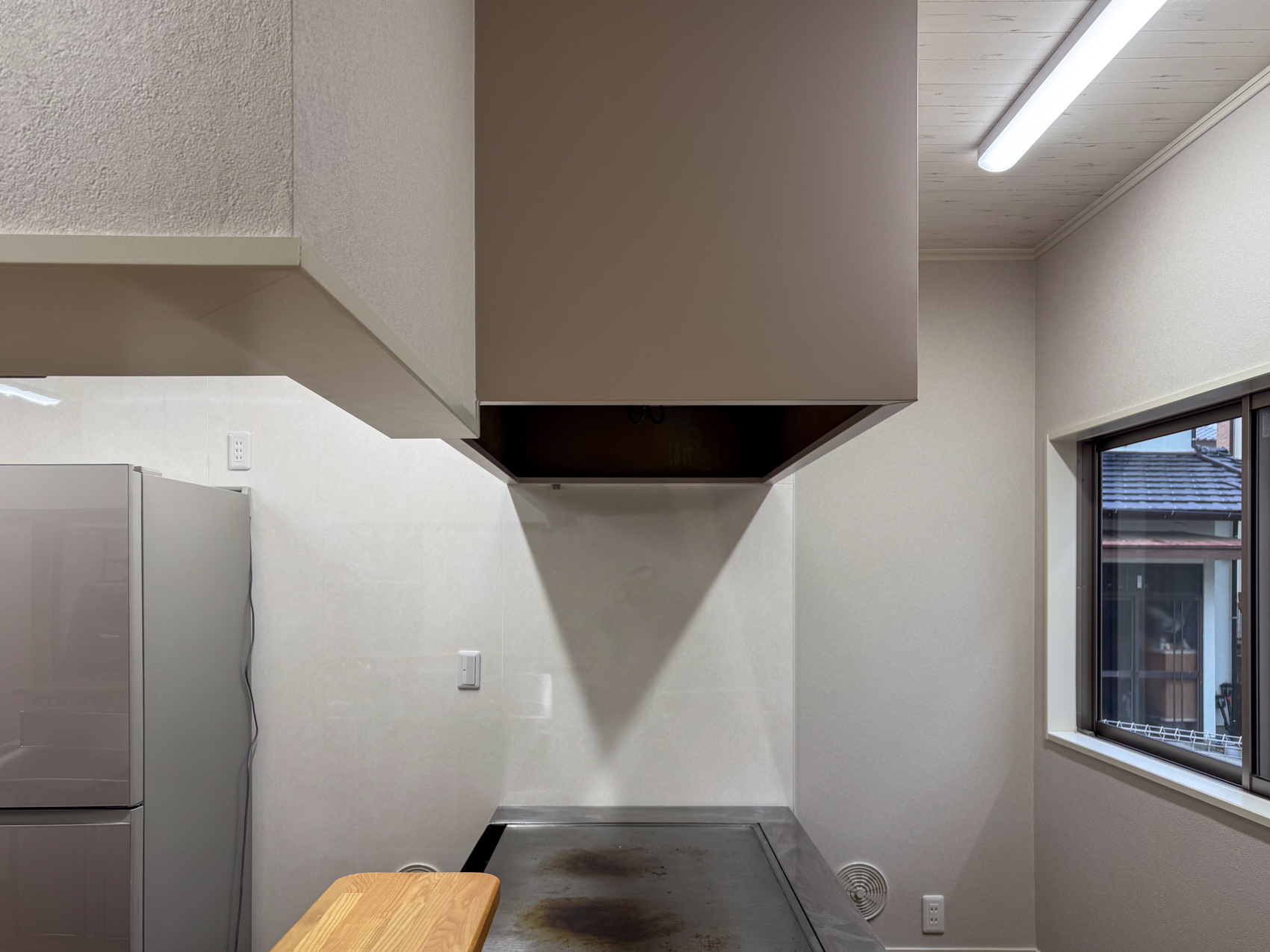 お施主さまこだわりの“大人ピンク”に塗り直したフードカバーが、空間のアクセントになっています。
