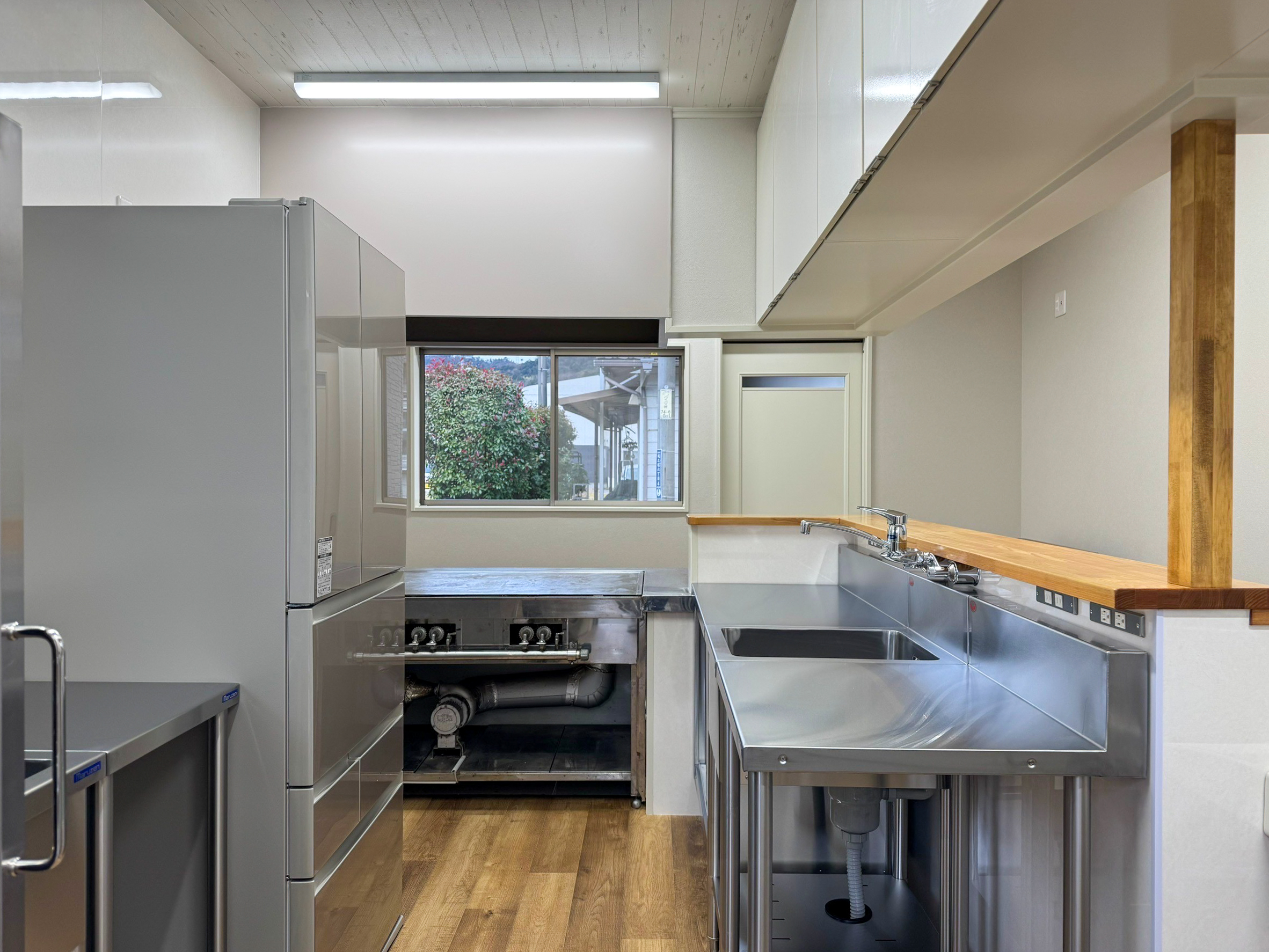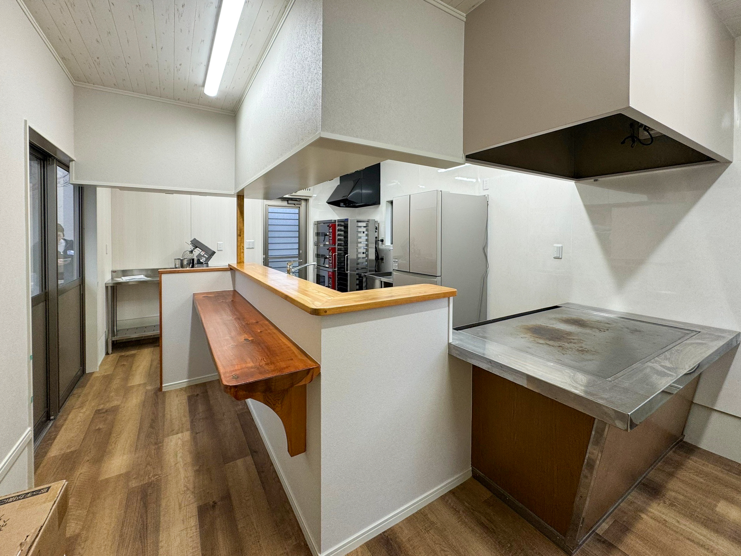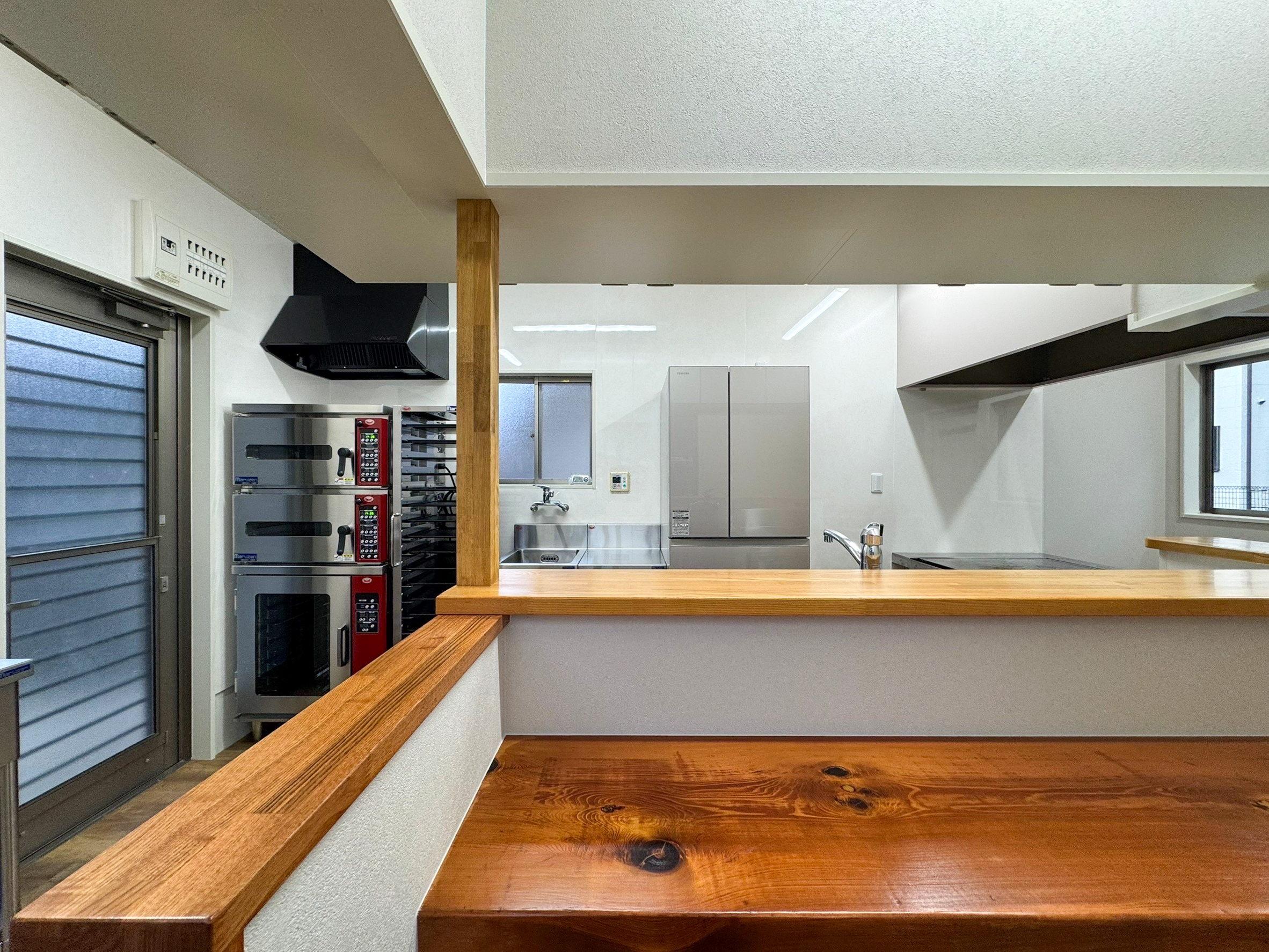 パン作りに必要な機材を設置するため、厨房スペースを広げ、壁にはお手入れがしやすいキッチンパネルを施工。